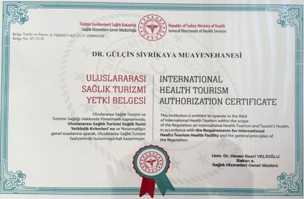 Tesisimiz, Uluslararası Sağlık Turizmi ve Turistin Sağlığı Hakkında Yönetmelik kapsamında, Uluslararası Sağlık Turizmi Sağlık Tesisi Yetkinlik Kriterleri’ne ve Yönetmeliğin genel esaslarına uyarak, Uluslararası Sağlık Turizmi faaliyetinde bulunmaya hak kazanmıştır.